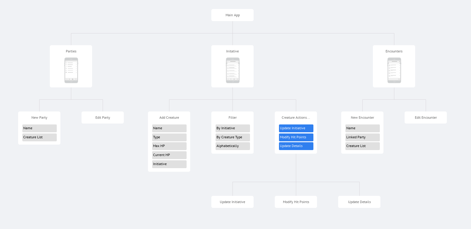 To start out, I mapped out the necessary sections of the app in a flow chart. From the beginning, I wanted to be sure that this app stayed focused around its use case. Many D&D-related apps have a tendency to spread out into multi-purpose products. Here, my goal was for this app to accomplish its sole purpose as perfectly as possible, allowing DMs to use it alongside other apps and platforms they might already be using.