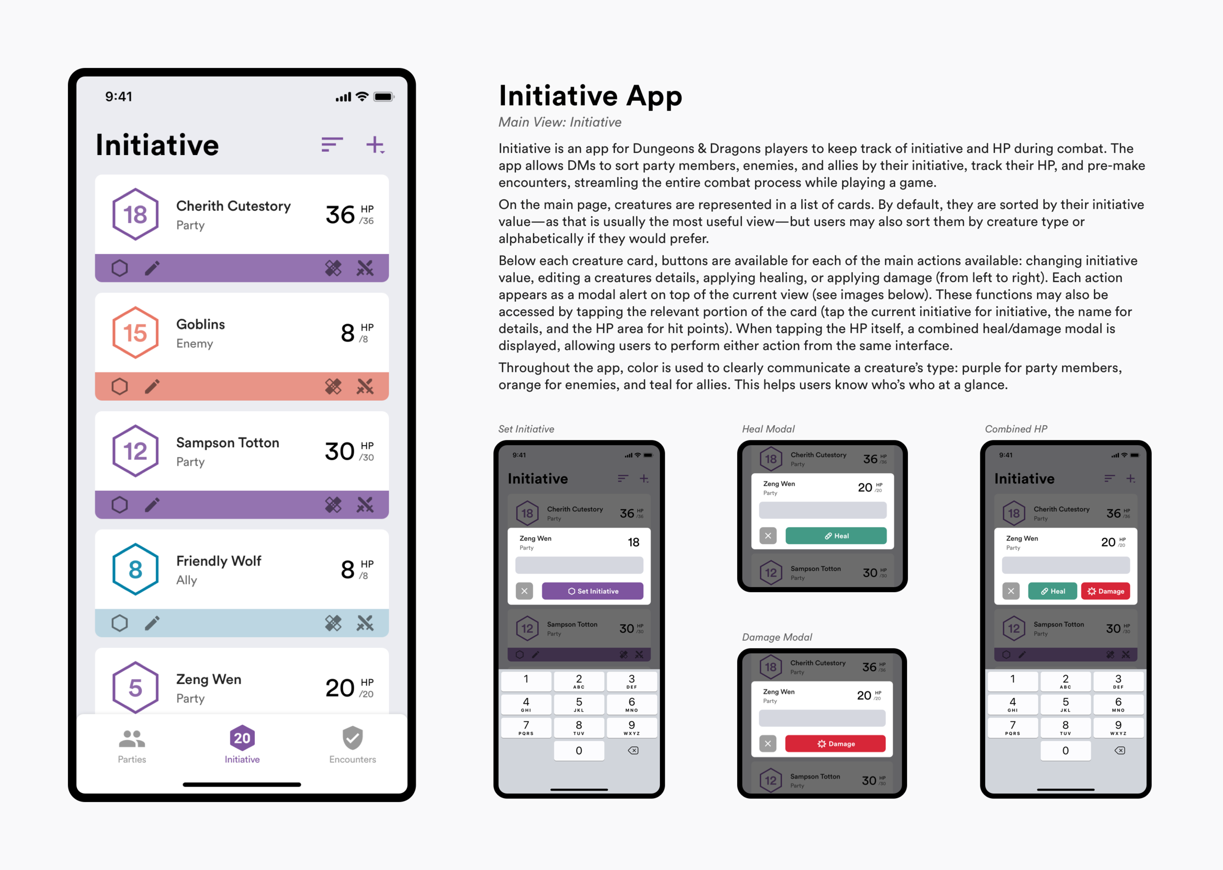 The Initiative app is a tool for dungeon masters to track initiative and HP during D&D combat. The app allows DMs to add party members, enemies, and allies to the initiative order, modify hit points, and track combat from round to round. Further, DMs can create reusable parties and encounters to make rolling initiative faster and easier while playing.