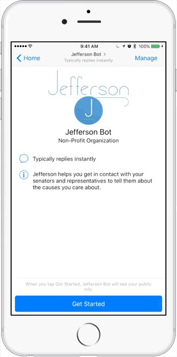 This bot uses mostly Messenger’s built-in tools for location and presentation, and the ProPublica Congress API to get congressional data.